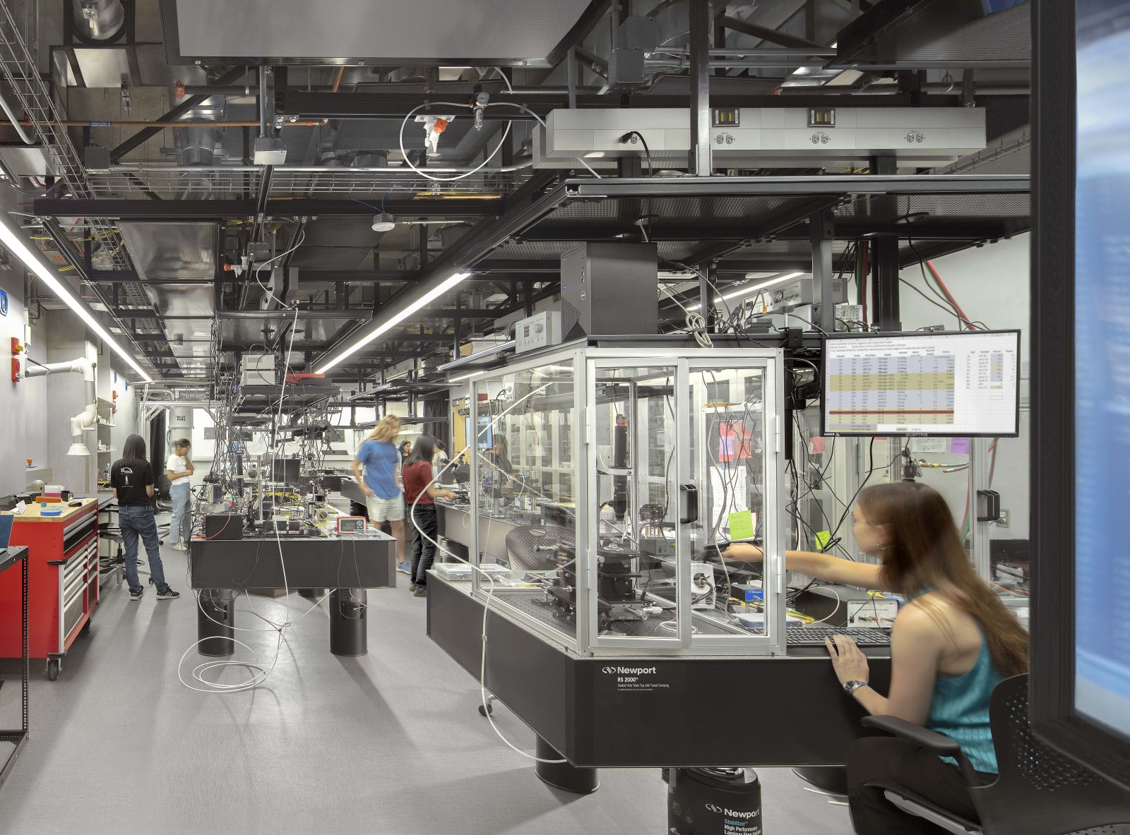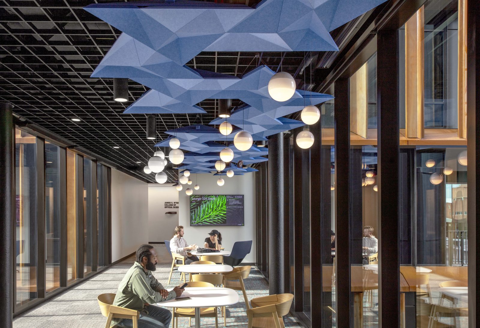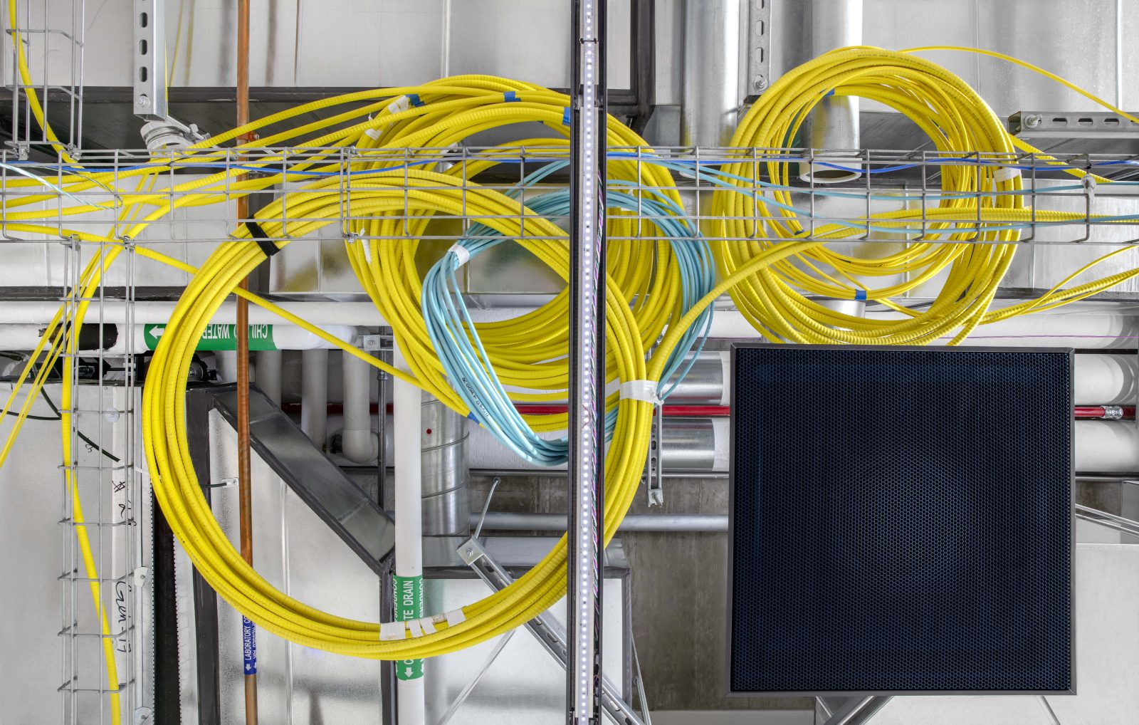 Additionally, our crews provided a complete branch system, cable tray routing, and advanced AV/voice-data infrastructure, alongside a university-specific fire alarm system. The lightning protection system was designed to ensure both functionality and aesthetic harmony with the surrounding architecture. Sturgeon Electric also led the design and installation of a custom laboratory ceiling equipment racking system, working closely with Kitchell, the project architects, and a specialized manufacturing team from New York. The modular system was fabricated off-site and precisely assembled on location to meet the lab’s specific needs.